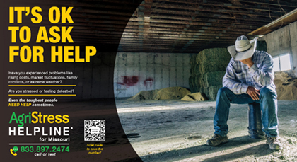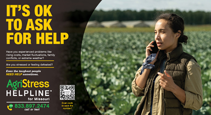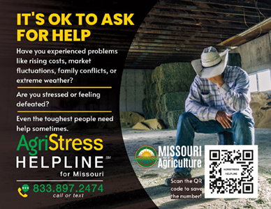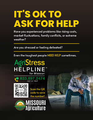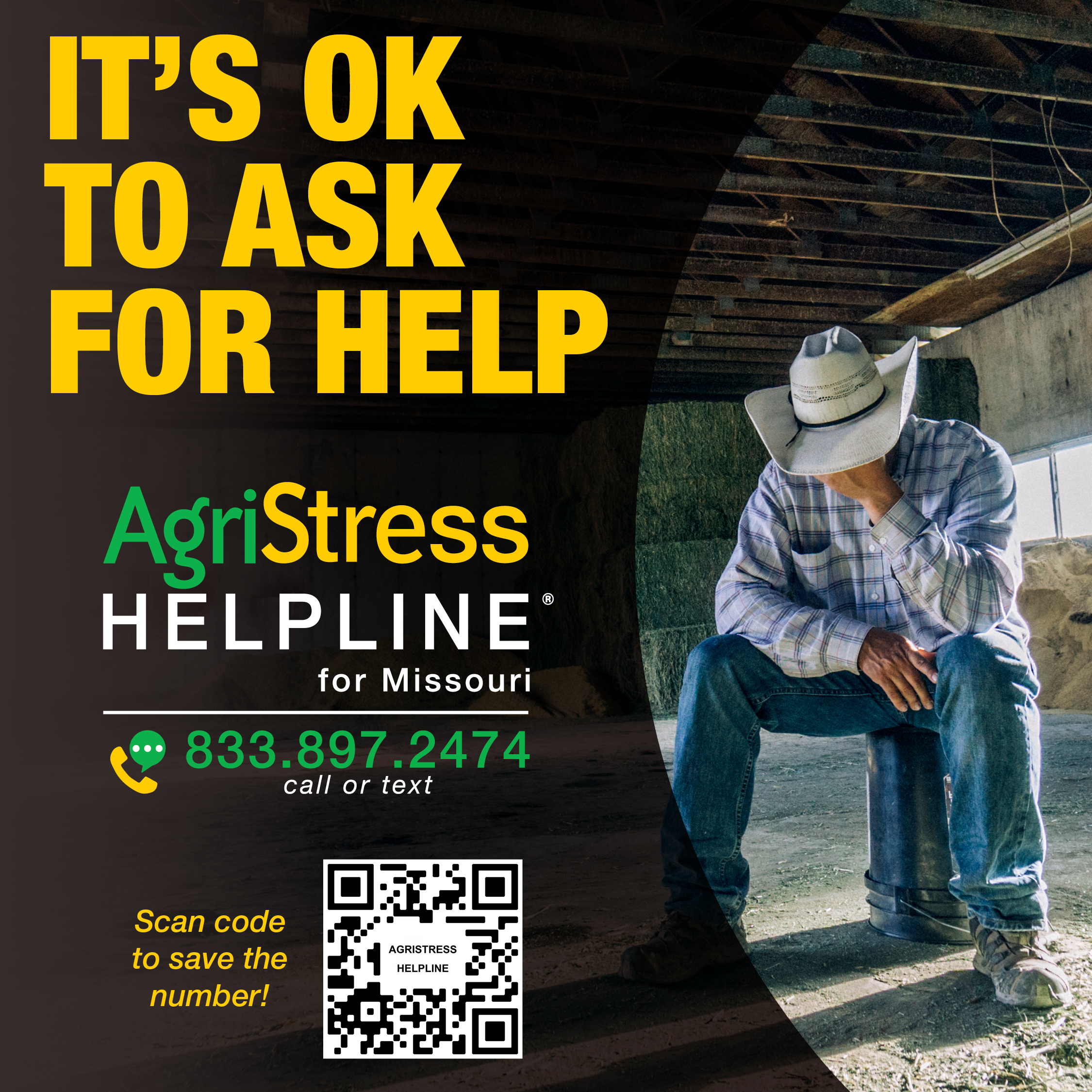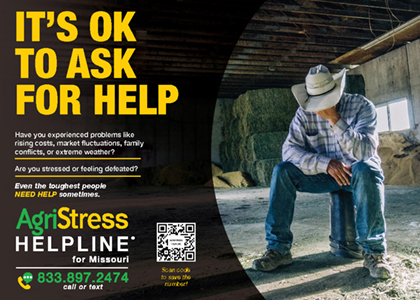 This is the official marketing toolkit for the AgriStress Helpline® for Missouri. You are welcome to download these materials and use them to promote the helpline however you see fit. Some examples include displaying a banner on your website, sharing an image to social media, placing a poster in your workplace, or handing out flyers at events.