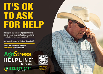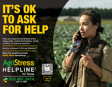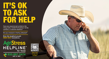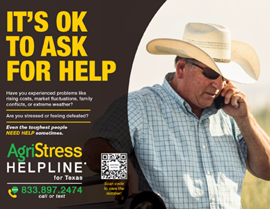 This is the official marketing toolkit for the AgriStress Helpline® for Texas. You are welcome to download these materials and use them to promote the helpline however you see fit. Some examples include displaying a banner on your website, sharing an image to social media, placing a poster in your workplace, or handing out flyers at events.