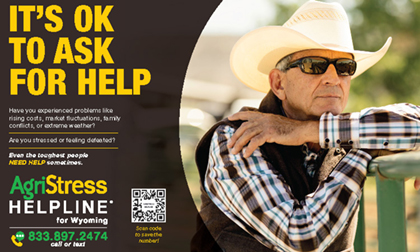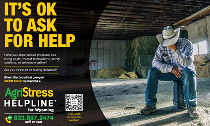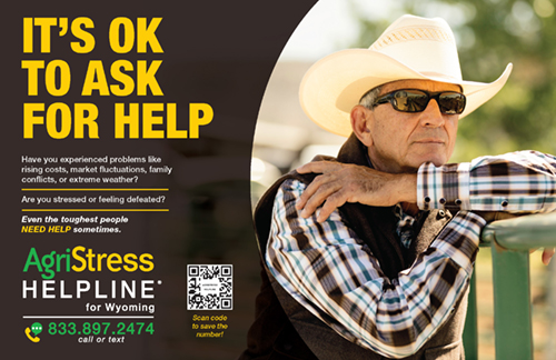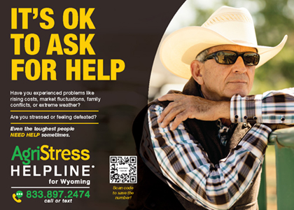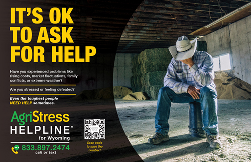 This is the official marketing toolkit for the AgriStress Helpline® for Wyoming. You are welcome to download these materials and use them to promote the helpline however you see fit. Some examples include displaying a banner on your website, sharing an image to social media, placing a poster in your workplace, or handing out flyers at events.